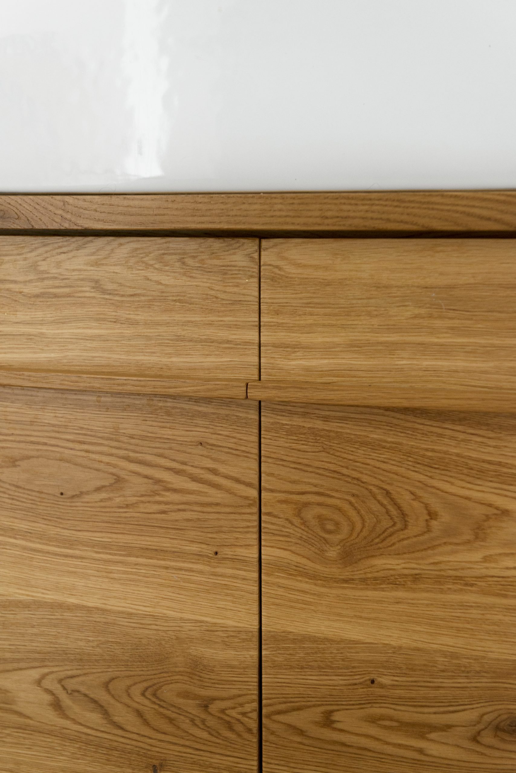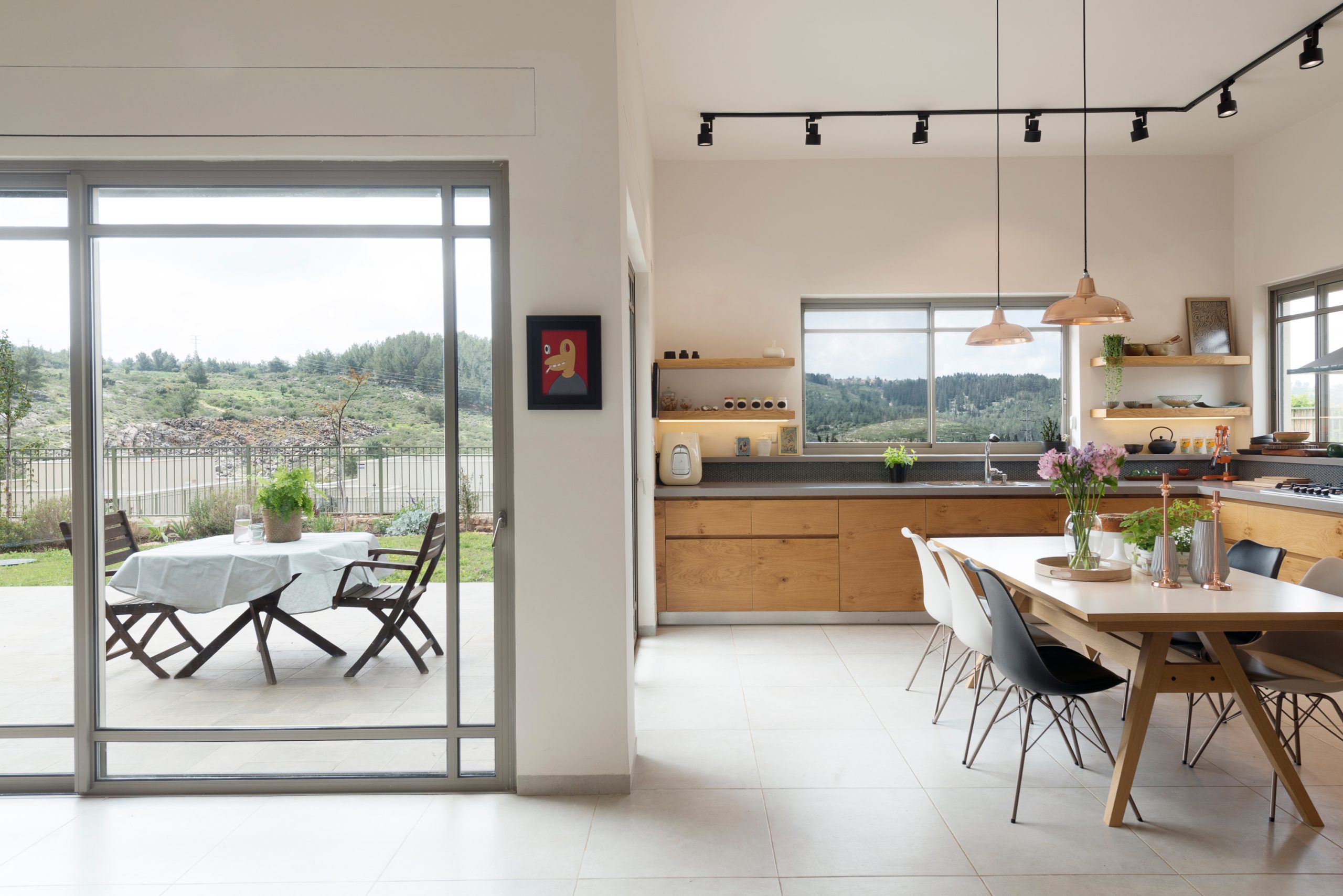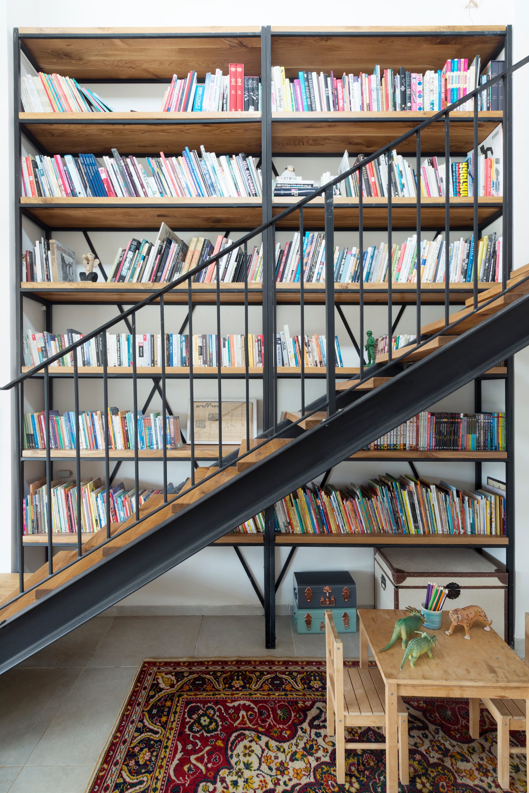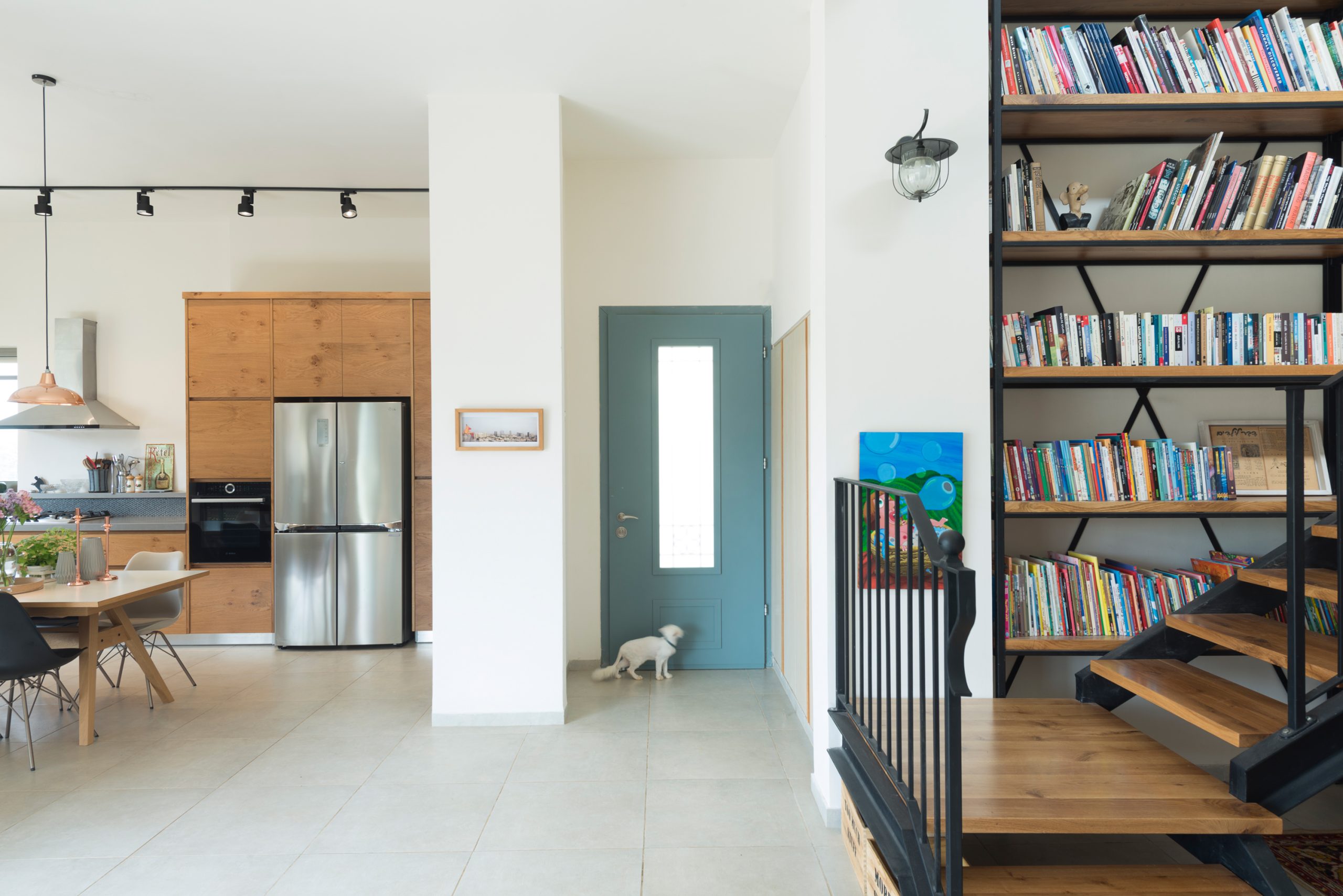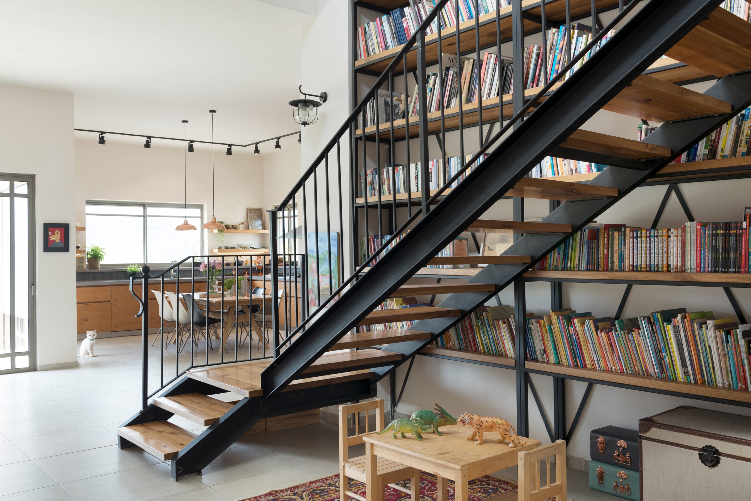 המטבח הרחב תוכנן בקווים מינימליסטיים עם אלמנטים דומיננטיים כמו ויטרינת ברזל, מדפי עץ גושניים ופרטי נגרות ייחודיים. גרם מדרגות מברזל ועץ, המשולב בספרייה ופינת משחקים, מהווה אלמנט מרכזי בבית ומבטא את השפה העיצובית כולה.