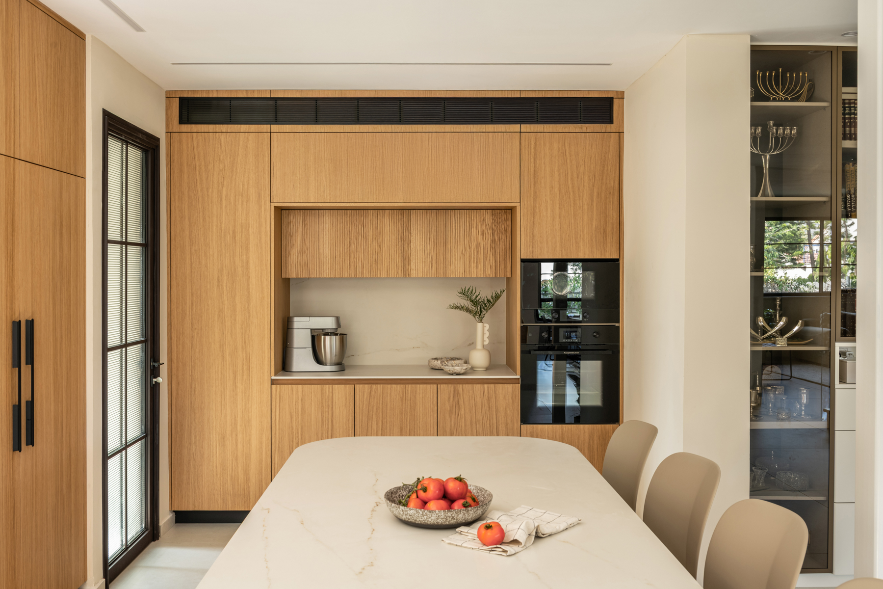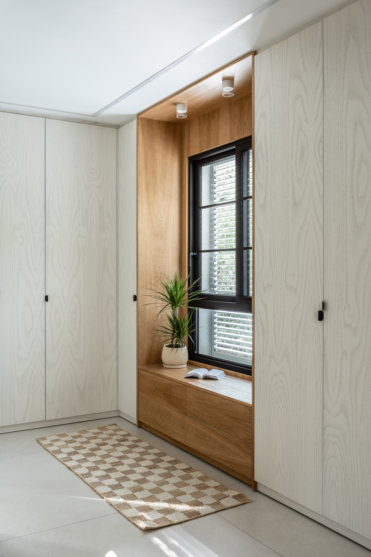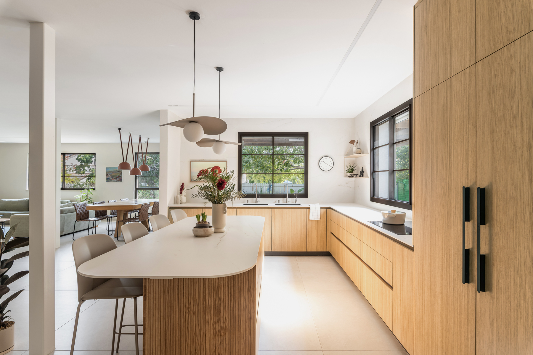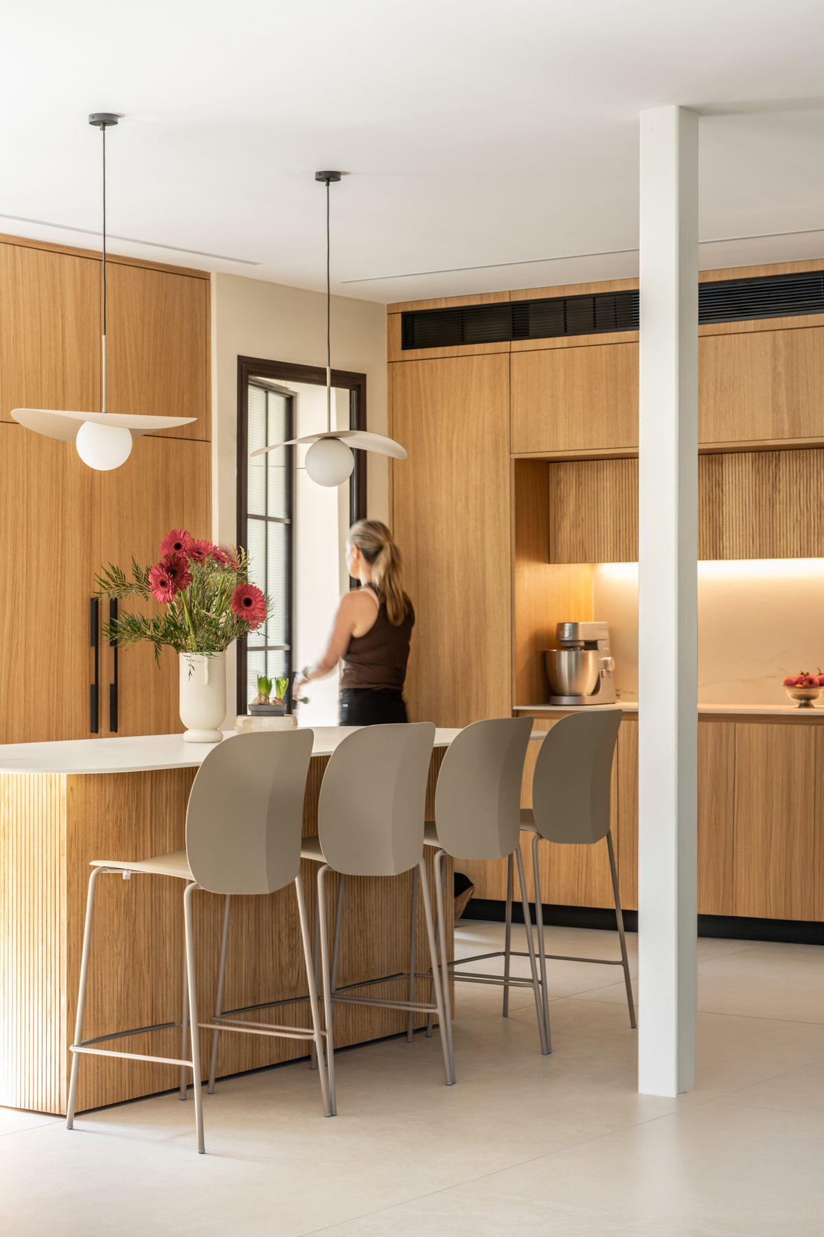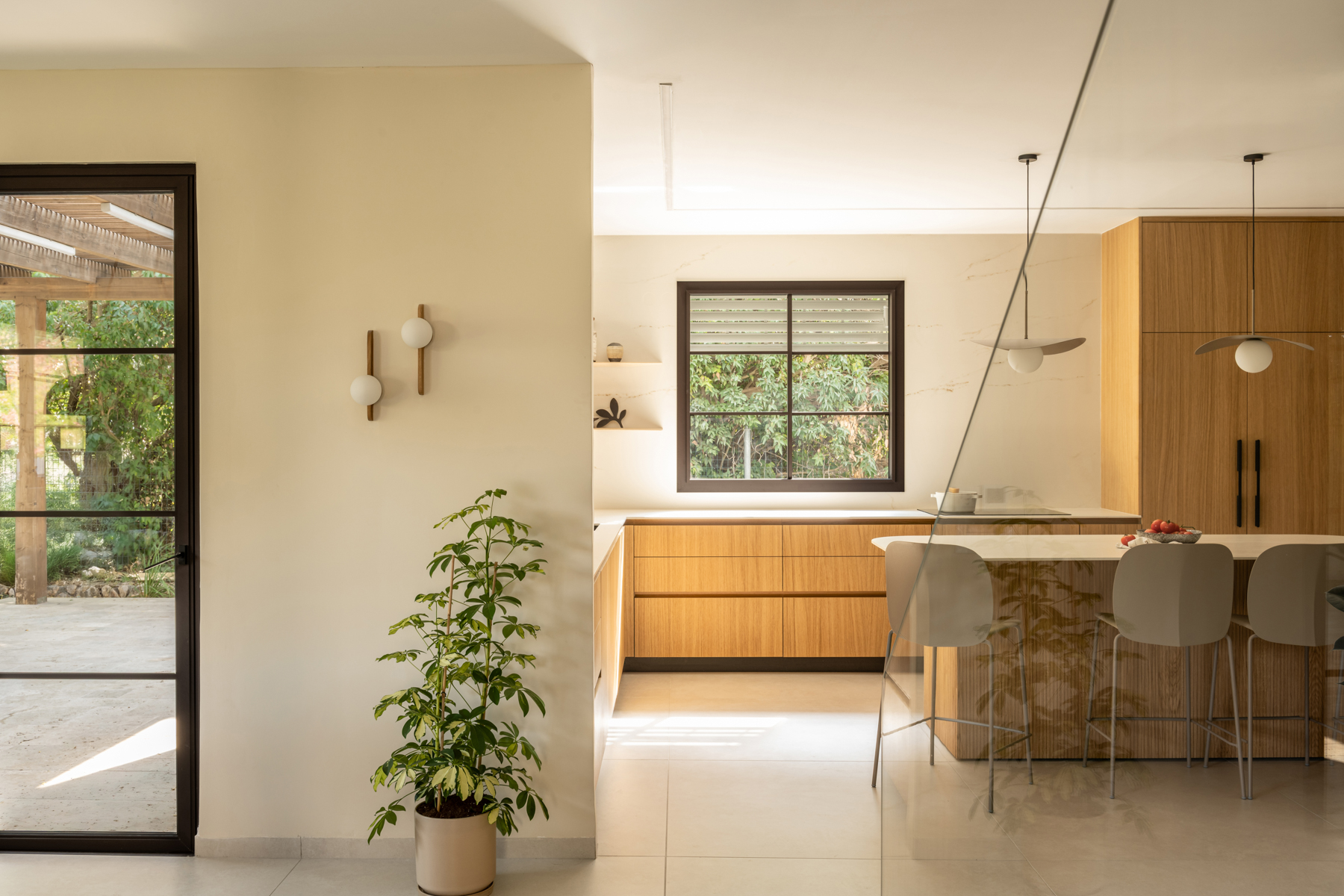 המטבח זכה להתייחסות מיוחדת והורחב על חשבון חדר כביסה קטן וצפוף. חדר כביסה חדש נבנה מחוץ לבית בבנייה קלה, מה שאפשר תכנון מרווח ופונקציונלי יותר של החלל המרכזי. בבית הותקנו מערכות חדשות, בהן חימום תת ־רצפתי ומערכות מיזוג מתקדמות. חדר ההורים אורגן מחדש והורחב על חשבון חדר ילדים סמוך שבוטל, והפך לחלל נעים ומרווח הכולל ארון קיר גדול, חלון עם ספסל ישיבה ומיקום קרוב למקלחת, לזרימה נוחה בין החללים. השיפוץ יצר בית מודרני, מואר ופונקציונלי, עם חללים רחבים ונוחים, המותאמים לחיים החדשים של בני הזוג ומשלבים תכנון מדויק עם תחושת חמימות וביתיות.