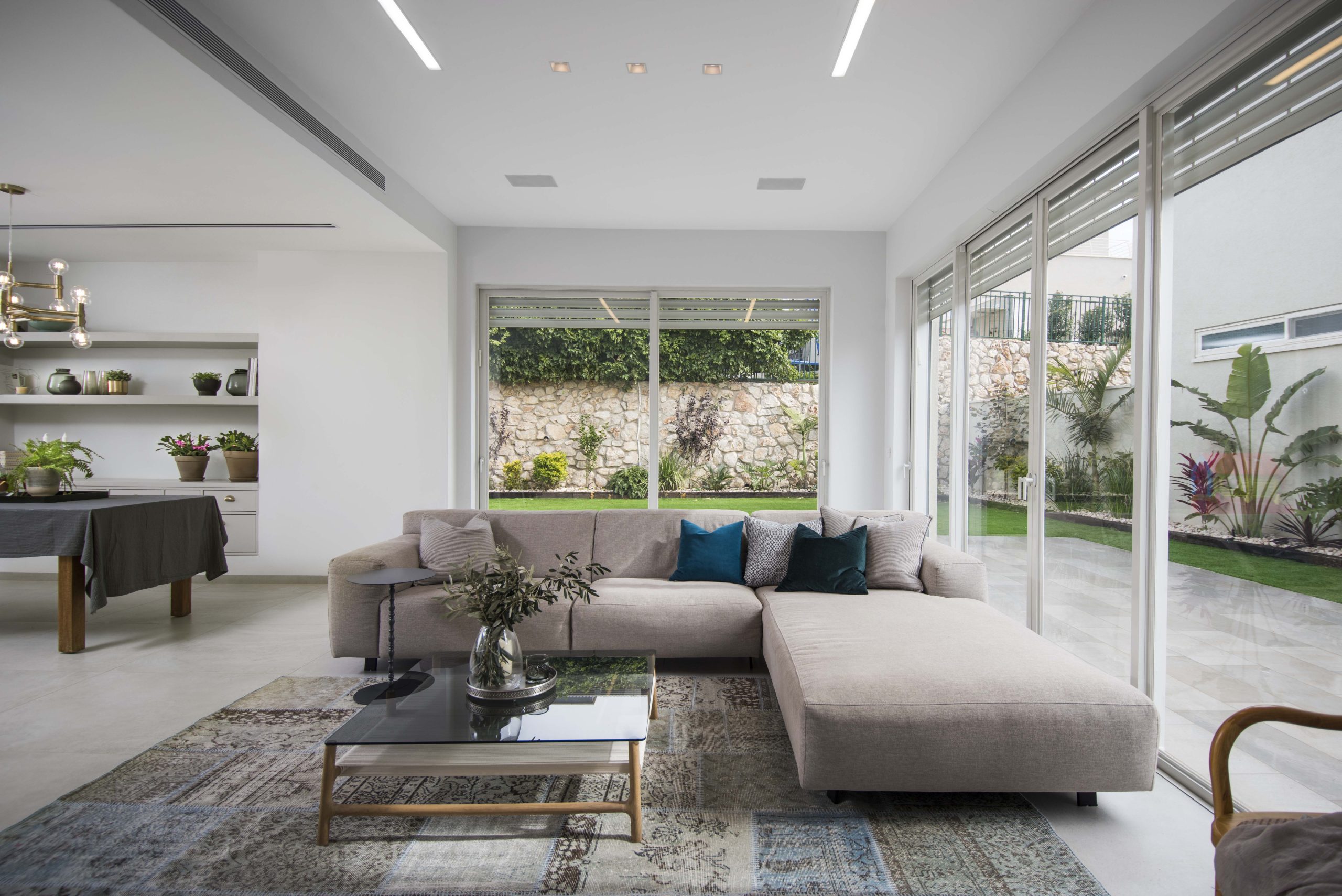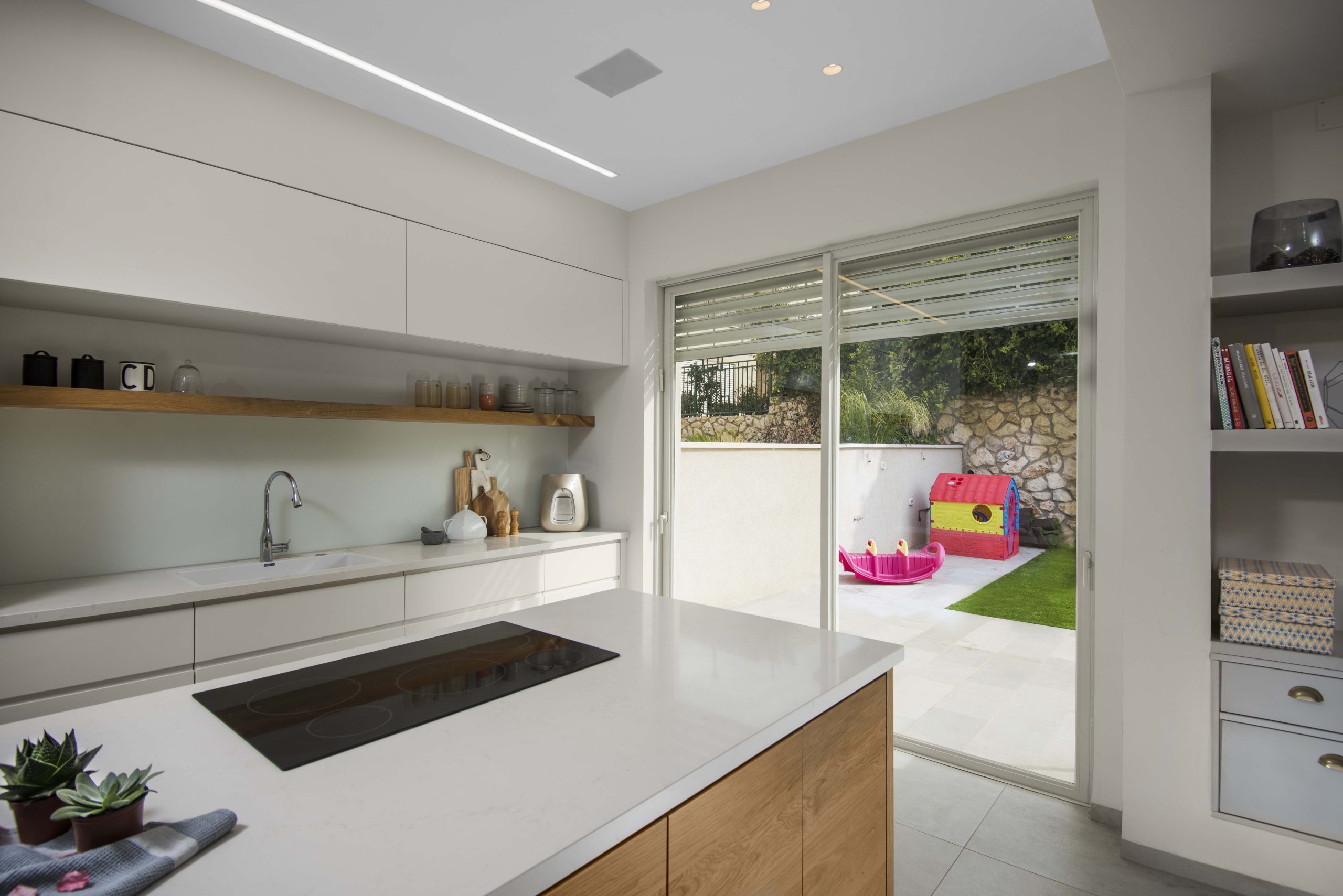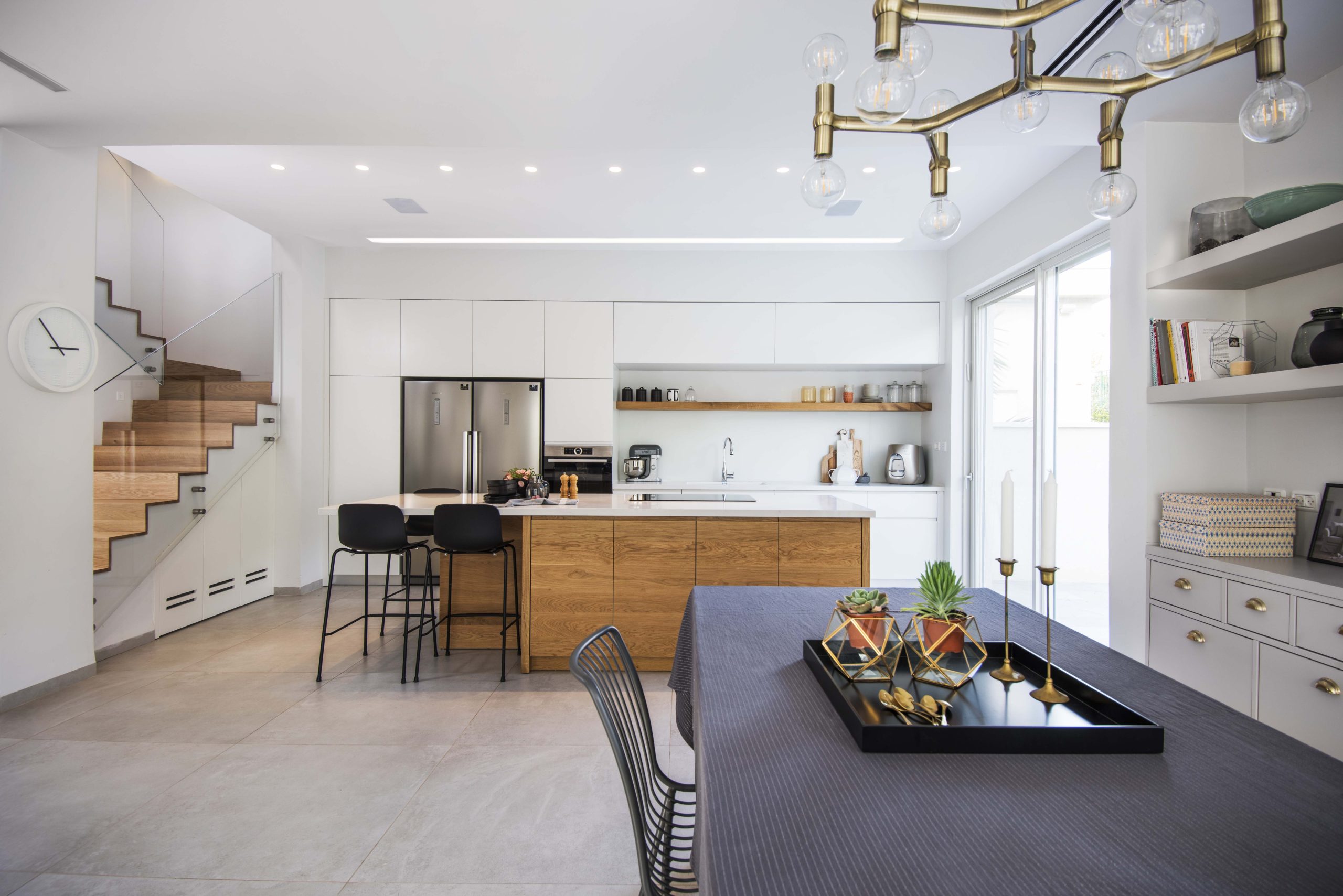 הקונספט העיצובי התגבש לאורך התהליך, מתוך שיח והיכרות עם המשפחה. שירותי האורחים הועברו מתחת לגרם המדרגות, מהלך שפתח את החלל ואפשר תוספת אחסון משמעותית. החלל הציבורי תוכנן כ־Open Space מואר, עם מטבח פתוח הכולל קיר פונקציונלי ואי בעץ אלון טבעי המוסיף חמימות
