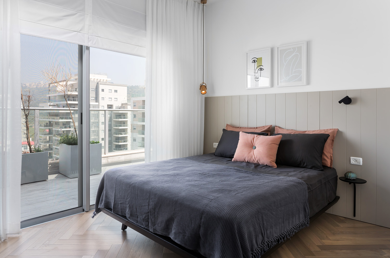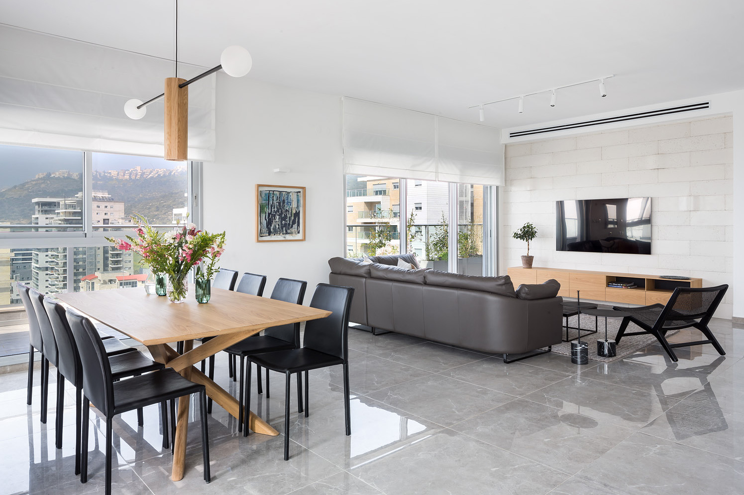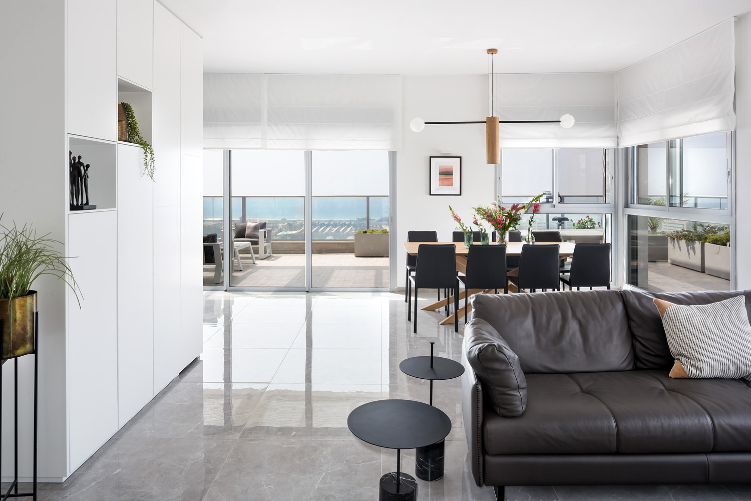 דירת פנטהאוז בעיצוב מודרני וחמים למשפחה צעירה, 160 מ"ר, מרפסות 117 מ"ר שתוכננה כבר מהשלבים הראשונים תוך מחשבה על משפחה מתפתחת. בני הזוג, המושפעים מעולם העיצוב והאירוח, ביקשו בית בקווים נקיים עם תחושת יוקרה מאופקת, בהשראת בתי מלון.