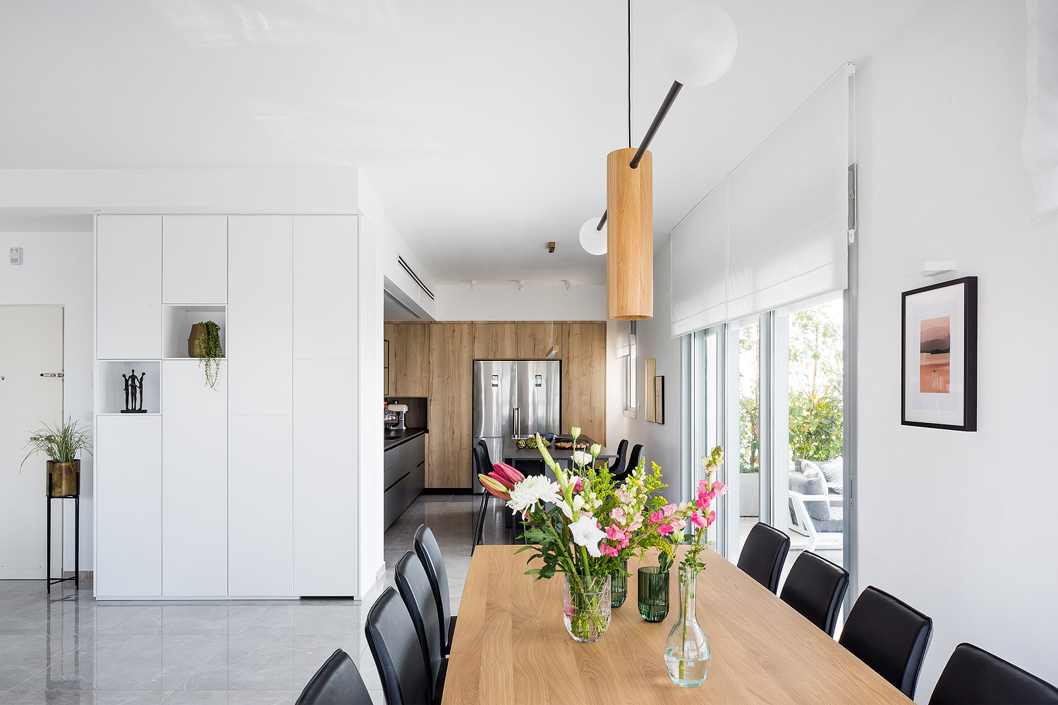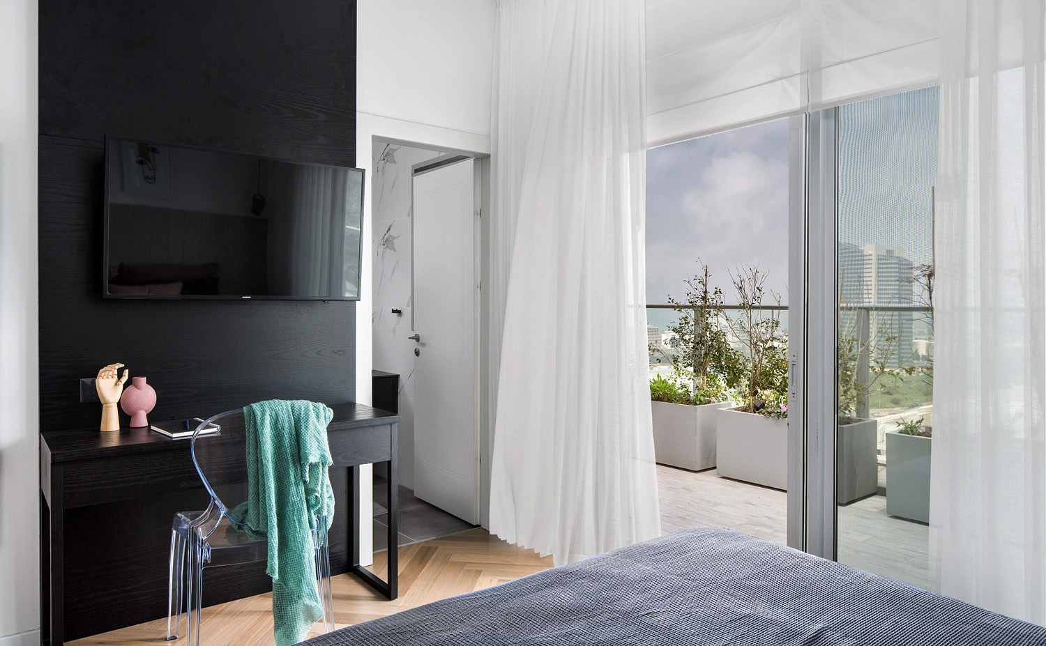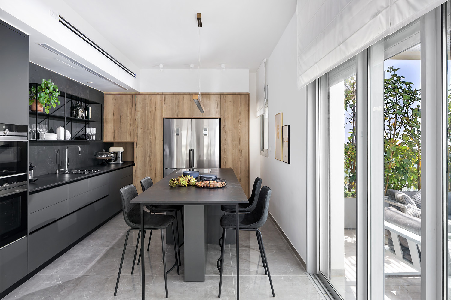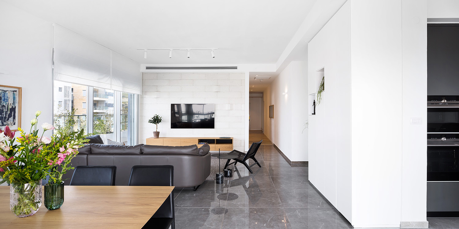 דירת פנטהאוז בעיצוב מודרני וחמים למשפחה צעירה, 160 מ"ר, מרפסות 117 מ"ר שתוכננה כבר מהשלבים הראשונים תוך מחשבה על משפחה מתפתחת. בני הזוג, המושפעים מעולם העיצוב והאירוח, ביקשו בית בקווים נקיים עם תחושת יוקרה מאופקת, בהשראת בתי מלון.