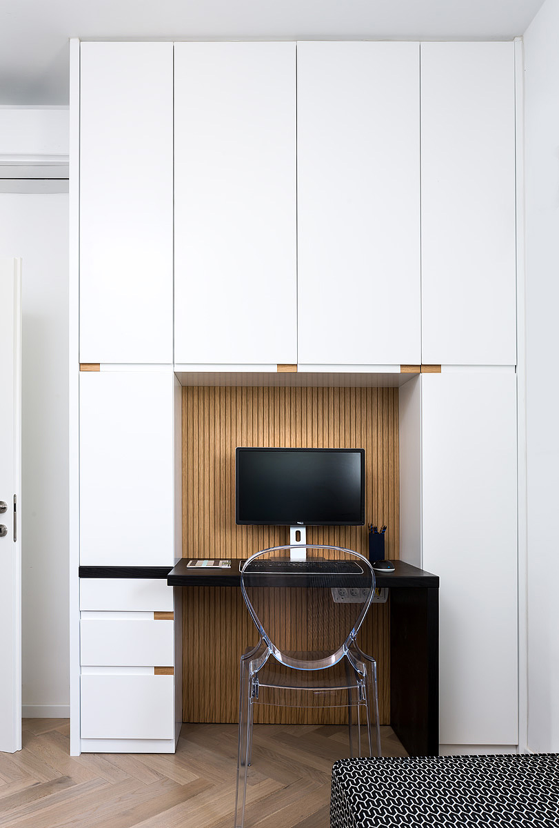 הדירה ממוקמת במבואות חיפה, בקומה גבוהה הפונה לנוף פתוח לים, ועוצבה בפלטת צבעים אורבנית של אפורים, חאקי, בטון ועץ טבעי. התכנון משלב פונקציונליות, חומרים טבעיים ופרטי נגרות ייחודיים ליצירת בית רגוע, אלגנטי ומזמין.