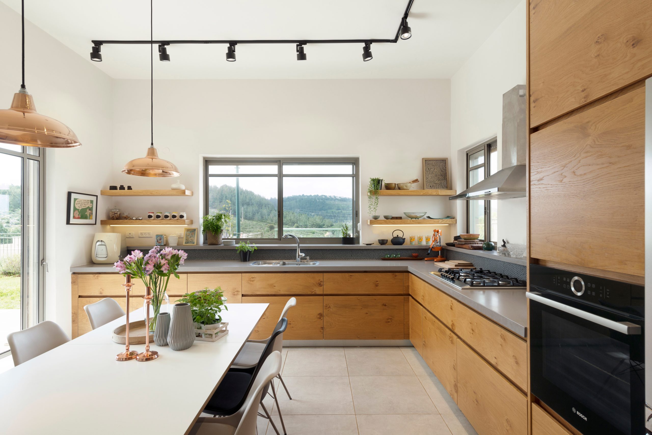 המטבח הרחב תוכנן בקווים מינימליסטיים עם אלמנטים דומיננטיים כמו ויטרינת ברזל, מדפי עץ גושניים ופרטי נגרות ייחודיים. גרם מדרגות מברזל ועץ, המשולב בספרייה ופינת משחקים, מהווה אלמנט מרכזי בבית ומבטא את השפה העיצובית כולה.